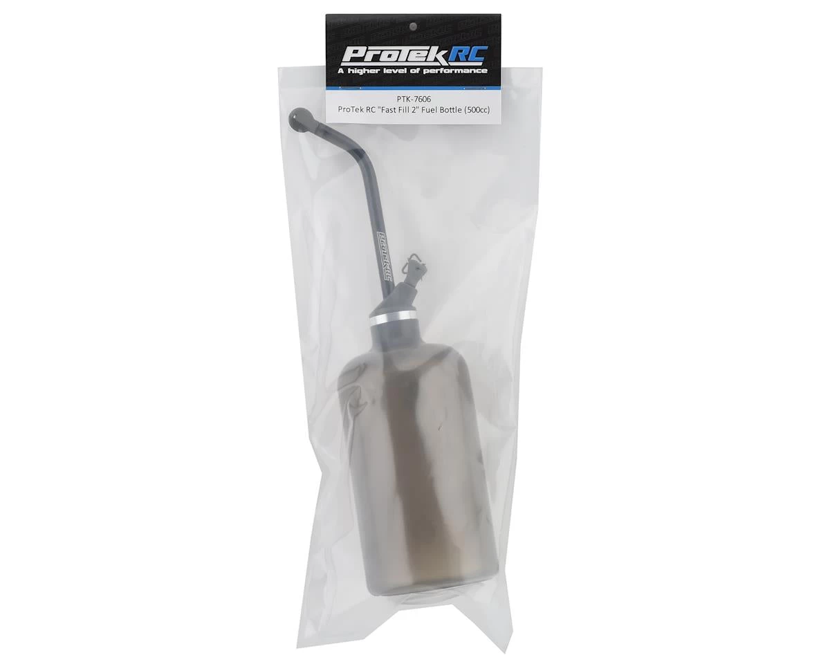 This is the ProTek R/C “Fast Fill 2” 500cc Fuel Bottle. The Fast Fill fuel bottle’s 500cc graduated reservoir holds enough fuel to last the duration of a long main event, while the super soft material makes it easy to fill your tank quickly. The molded cap plugs into the spout to prevent spills and keep dirt out of the bottle, and an extra cap is included so you have a backup in case you lose the primary cap. Plus, the bottle/spout seal assembly, includes a cap storage pocket, so you can use it to hold your cap during filling, or hold the spare so its easily accessible when needed.