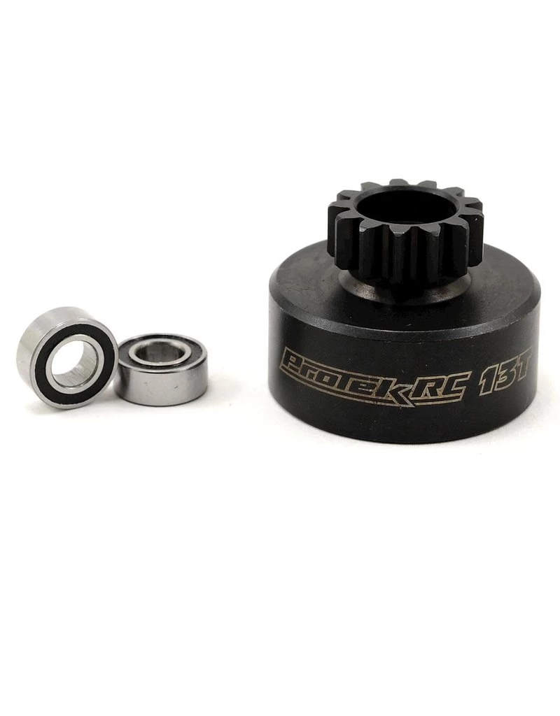 This is an optional ProTek R/C Hardened 13 tooth clutch bell. These clutch bells are hardened and precision cut, providing you with worry free performance that is on par with any manufacturer. The clutch bell is installed over the clutch shoes and will engage when the engine rpm’s increase, allowing the engines power to transfer to the center spur gear and the rest of the drive train. A clutch bell with fewer teeth than what you are using will provide increased bottom end acceleration with reduced top end speed, which is good for smaller technical tracks. A clutch bell with more teeth will increase top end speed, at the expense of reduced bottom end acceleration, which is good for larger flowing tracks. Includes two rubber sealed 5x10x4mm clutch bearings.