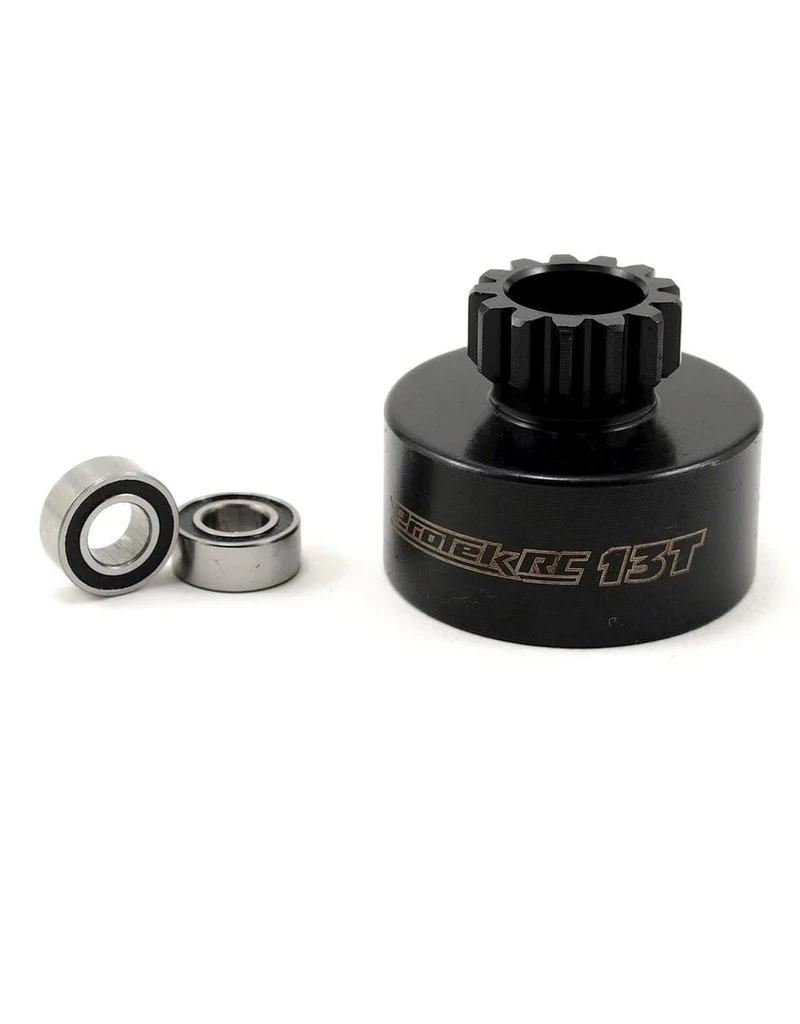 This is an optional ProTek R/C Hardened 13 tooth clutch bell for Mugen MBX5 and OFNA style clutch systems. These clutch bells are hardened and precision cut, providing you with worry free performance that is on par with any manufacturer. The clutch bell is installed over the clutch shoes and will engage when the engine rpm’s increase, allowing the engines power to transfer to the center spur gear and the rest of the drive train. A clutch bell with fewer teeth than what you are using will provide increased bottom end acceleration with reduced top end speed, which is good for smaller technical tracks. A clutch bell with more teeth will increase top end speed, at the expense of reduced bottom end acceleration, which is better suited to larger flowing tracks. Includes two rubber sealed 5x10x4mm clutch bearings.