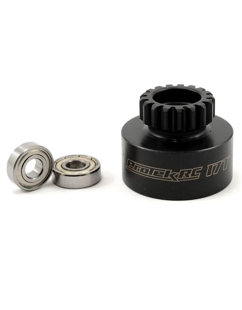 This is an optional ProTek R/C Hardened 17 tooth clutch bell for Mugen MBX5 and OFNA style clutch systems. These clutch bells are hardened and precision cut, providing you with worry free performance that is on par with any manufacturer. They also use the larger and more durable 5x12x4mm bearing in the inner and outer position, for increased load carrying capabilities. The clutch bell is installed over the clutch shoes and will engage when the engine rpm’s increase, allowing the engines power to transfer to the center spur gear and the rest of the drive train. A clutch bell with fewer teeth than what you are using will provide increased bottom end acceleration with reduced top end speed, which is good for smaller technical tracks. A clutch bell with more teeth will increase top end speed, at the expense of reduced bottom end acceleration, which is better suited to larger flowing tracks. Includes two metal shielded 5x12x4mm clutch bearings.