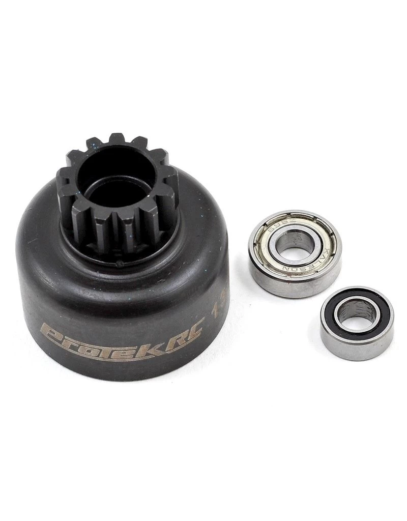 This is an optional ProTek R/C Hardened 13 tooth clutch bell for Losi style clutch systems. These clutch bells are hardened and precision cut, providing you with worry free performance that is on par with any manufacturer. They also use the standard Losi large 5x13mm bearing in the inner position and a 5x10mm bearing in the outer position. The clutch bell is installed over the clutch shoes and will engage when the engine rpm’s increase, allowing the engines power to transfer to the center spur gear and the rest of the drive train. A clutch bell with fewer teeth than what you are using will provide increased bottom end acceleration with reduced top end speed, which is good for smaller technical tracks. A clutch bell with more teeth will increase top end speed, at the expense of reduced bottom end acceleration, which is better suited to larger flowing tracks. Includes one 5x13mm metal shielded bearing, and one 5×10 rubber sealed bearing.