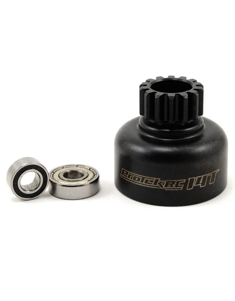 This is an optional ProTek R/C Hardened 14 tooth clutch bell for Losi style clutch systems. These clutch bells are hardened and precision cut, providing you with worry free performance that is on par with any manufacturer. They also use the standard Losi large 5x13mm bearing in the inner position and a 5x10mm bearing in the outer position. The clutch bell is installed over the clutch shoes and will engage when the engine rpm’s increase, allowing the engines power to transfer to the center spur gear and the rest of the drive train. A clutch bell with fewer teeth than what you are using will provide increased bottom end acceleration with reduced top end speed, which is good for smaller technical tracks. A clutch bell with more teeth will increase top end speed, at the expense of reduced bottom end acceleration, which is better suited to larger flowing tracks. Includes one 5x13mm metal shielded bearing, and one 5×10 rubber sealed bearing.