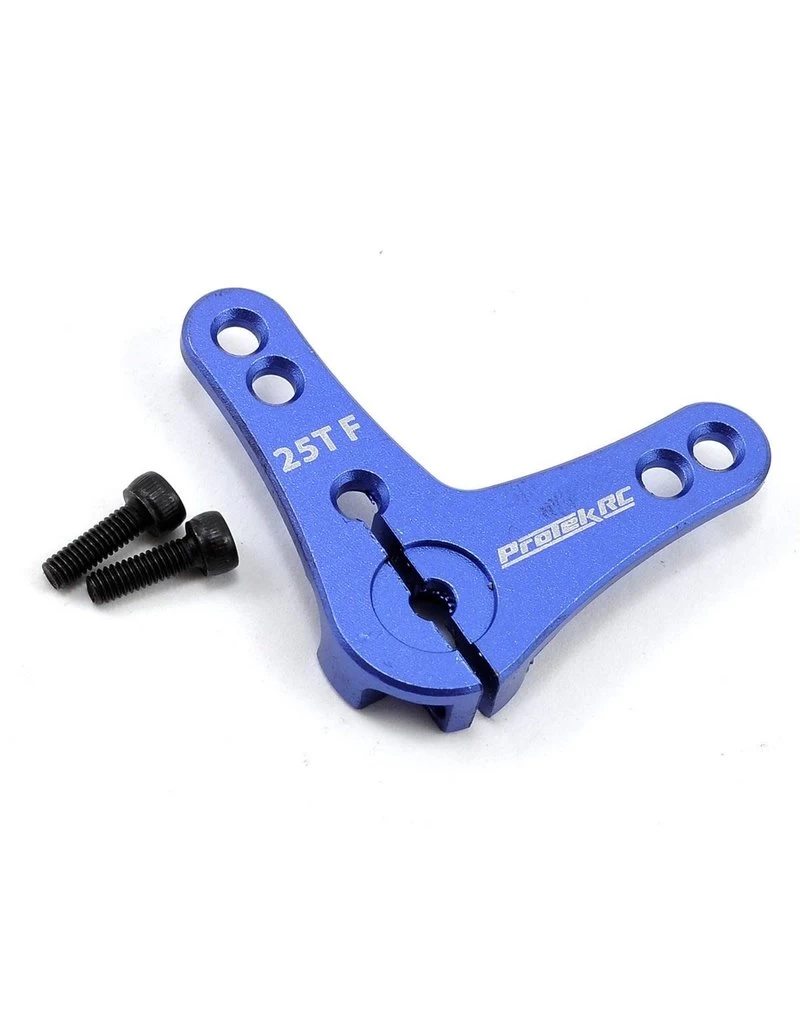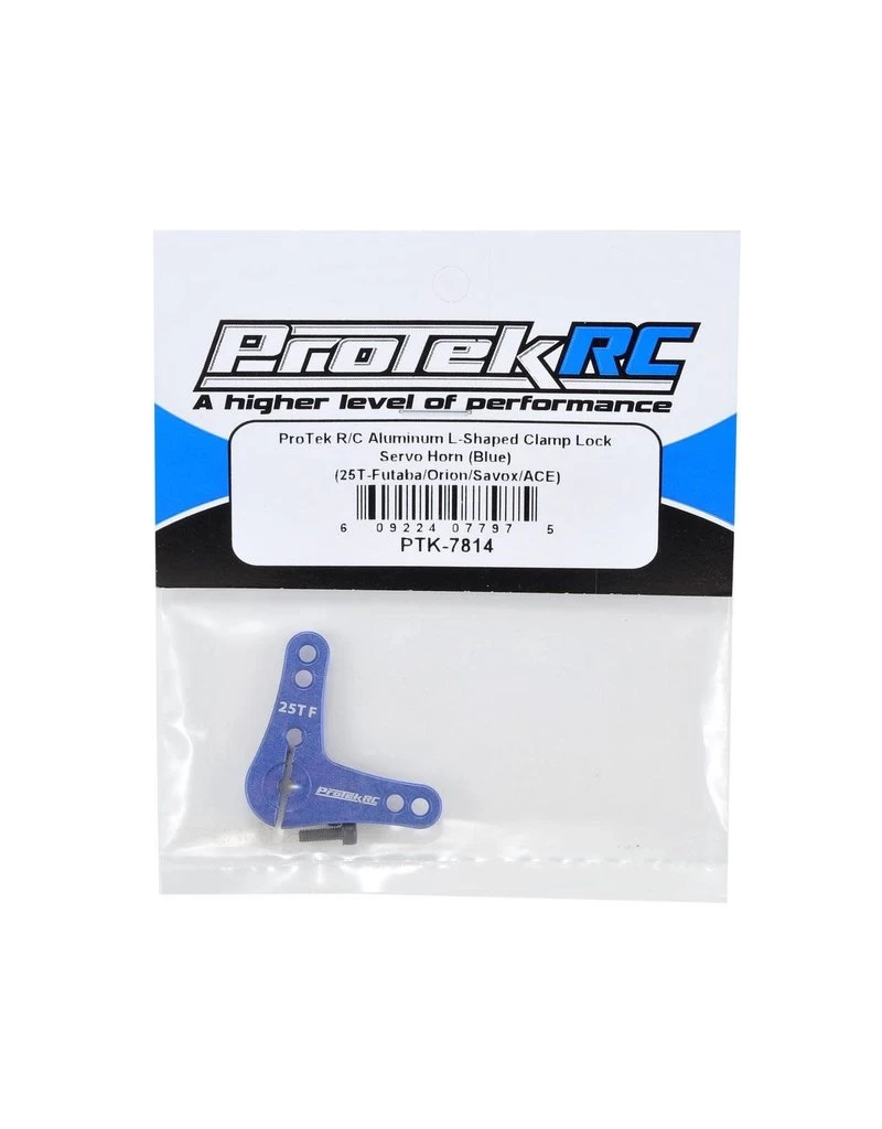 This is a ProTek R/C Aluminum L-Shaped Clamp Lock Servo Horn, and is intended for use with any servo that uses a 25 tooth spline output shaft. This extremely tough servo-horn has been machined from a solid block of aluminum for incredible precision, rigidity and durability. This horn features a clamp type design that grips the servo’s output shaft with enough force that even if the retainer screw comes loose, the horn will remain in place, increasing your chances of finishing the race! Additionally, the arm is 2mm thick, has 19.75mm & 24.25mm hole spacing and uses 3mm hardware to suit the geometry and hardware requirements of most vehicles.
