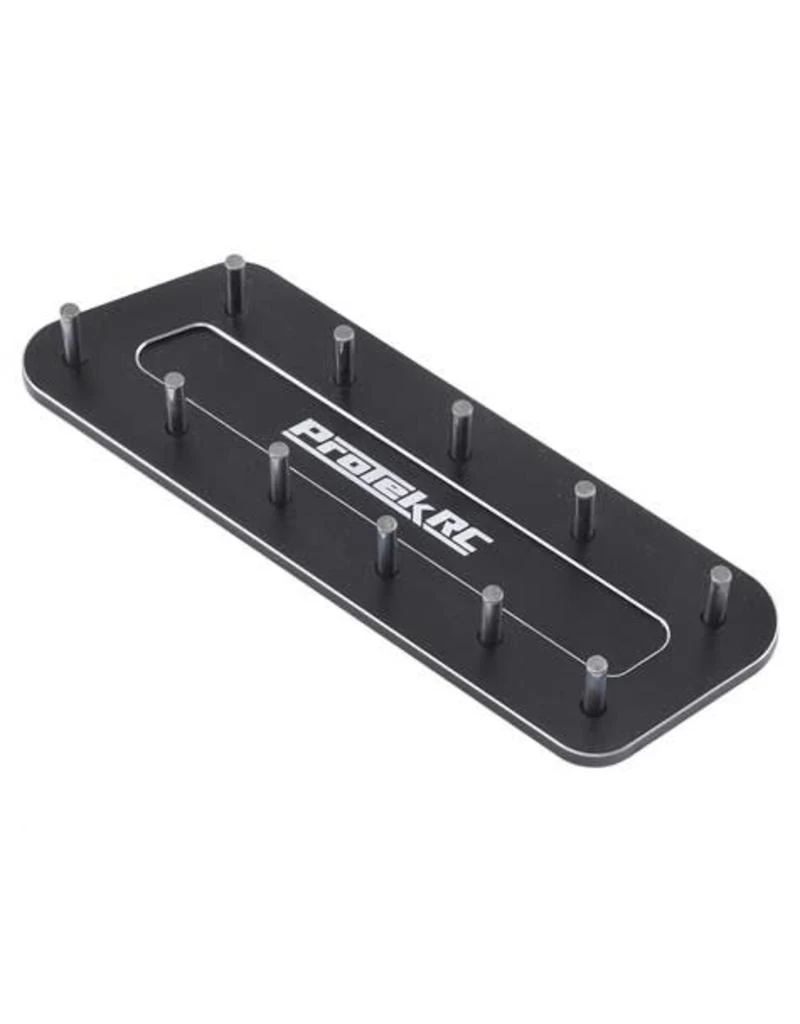 The ProTek R/C Aluminum 1/10 Pinion Gear Caddy is a must have addition for any tool box or pit bag. This pro-grade accessory will help you keep your valuable pinion gears safe and easily accessed. The machined aluminum plate features a black anodized finish, with chamfered edges and a laser engraved logo. With room for up to 11 pinions on the 1/8″ diameter steel posts, you can keep the gears you need most within easy reach, and get your gear ratio dialed for any track condition.