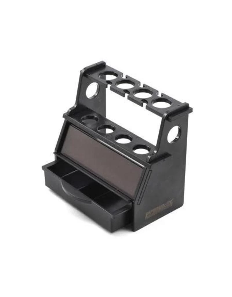 This stand features a twin deck design and a lower pull out drawer with two compartments. The upper deck is used to hold shock bodies and features four 16mm diameter holes that taper to 15mm, making it compatible with a variety of shock types. The upper deck also has six slots that can be used to hold shock shafts. The lower deck features four 14mm holes that taper down to 12mm, and is used to hold shock caps. The lower deck also features an 85mm long scale that can be used to measure the distance between the bottom of the shock body and the top of the shock end, as well as rebound, shock shaft length and more for a precise build. The upright plate has a magnetic strip with a 7mm deep lip that can be used to hold small screws, c-clips and other small steel items.