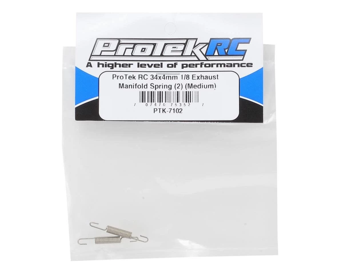 This is a set of two ProTek R/C 1.25″ Medium Length Exhaust Manifold Springs intended for use with 1/8 scale nitro engines with mounting tabs on the both sides of the engine case. These springs attach the tuned pipe manifold to the engine case using the spring tabs; if you’re engine does not have spring tabs you will need the wrap around style long springs (PTK-7100).